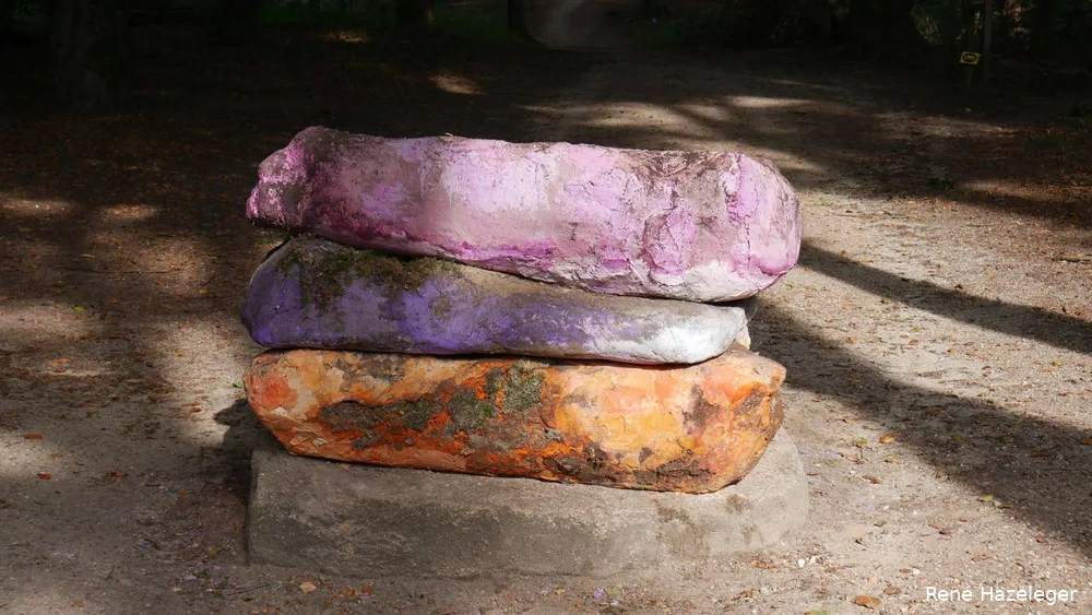 Voor haar werk maakte Hoogendijk drie replica’s van de Bloedsteen en stapelde die op elkaar. De zachte, poreuze varianten — uitgevoerd in contrasterende pasteltinten van natuurlijke materialen — waren bedoeld als levende sculpturen. Zaden, mossen en kleine organismen konden er hun plek in vinden, terwijl regen, zon en wind het werk langzaam lieten veranderen. Zo verbeeldde Give and Take de continue wisselwerking tussen mens, natuur en tijd.