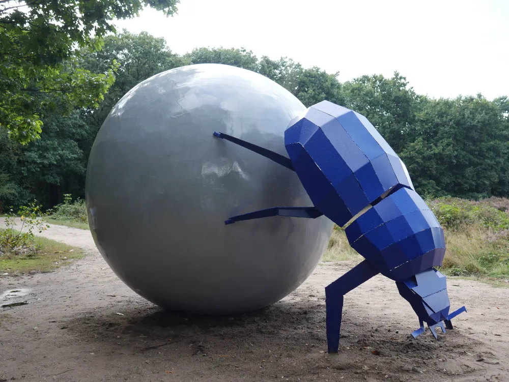Het kunstenaarsduo DWAZEDENKERS – bestaande uit Dely Vossers en René Bekkers – maakte een indrukwekkend groot kunstwerk van de kever. Wat op het eerste gezicht speels en humoristisch oogt, blijkt bij nader inzien een diepere betekenis te hebben. Hun creatie, een reusachtige mestkever die een glanzende bol voortduwt, symboliseert de veranderende verhouding tussen mens en natuur.