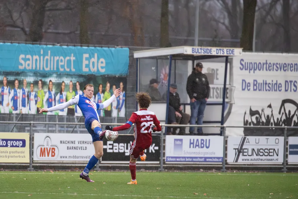 DTS Ede bleek vandaag al vrij snel de betere ploeg te zijn. Het wist vanaf het begin de gasten flink onder druk te zetten en was enige malen kansrijk in de beginfase. In de 5e minuut was er het schot van Stijn Homburg en even later kopte hij in kansrijke positie - op aangeven van Frank Boers - over. Het was echter tegen alle verhoudingen in DUNO dat bij de eerste uitbraak de score opende. De Edese defensie kreeg een voorzet vanaf de linkerflank niet uitverdedigd en het was Mitchell Jansen die eenvoudig binnen kon werken; 0-1. Niet veel later waren de gasten wederom gevaarlijk, maar bracht doelman Robin Franken redding. DTS Ede pakte de draad weer op en wist in de 31e minuut de terechte gelijkmaker te noteren. Nehkomi Veldt werd aangespeeld rand zestien en kon vrij inschieten na een goede loopactie van Stijn Homburg; 1-1. DTS Ede ging op zoek naar meer en was dichtbij met een schuiver van Frank Boers, die net naast ging. Even later was hij wel succesvol. Ditmaal was het de thuisploeg die razendsnel counterde en met vier man op het vijandige doel af kon. De steekpass werd door Nehkomi Veldt precies op het juiste moment gegeven en Frank Boers schoot binnen; 2-1.