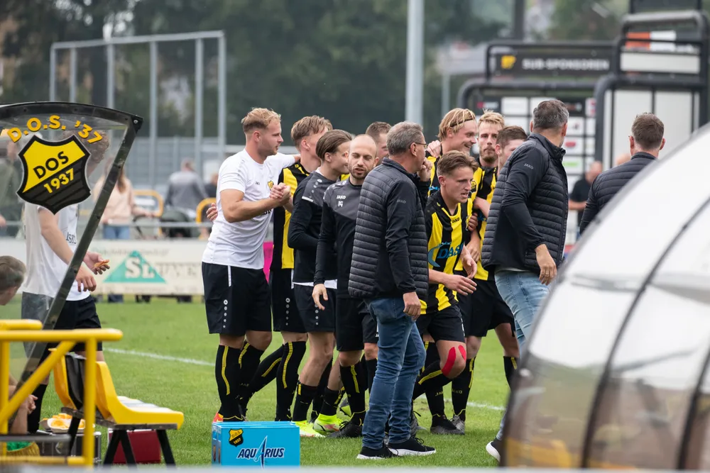 Na ruim 11 maanden onderbreking wegens COVID-19 was er vandaag dan eindelijk weer competitievoetbal. En wat een affiche om mee te starten. In Vriezenveen werden de kicksen aangetrokken om het op te nemen tegen DOS '37. Historisch gezien een lastige tegenstander voor de Edenaren. En ook vandaag was het niet anders. De thuisploeg startte fel en was in de 5e minuut al dicht bij een openingstreffer. Een strakke voorzet vanaf links werd gemist door de uit zijn doel komende Robin Franken en Menno Kamphuis had hem voor het inprikken. De bal ging echter naast. DOS '37 speelde een opportunistisch spelletje waar DTS Ede het lastig mee had. Het kon zich amper onder de druk uit voetballen. Pas in de 13e minuut was een afstandsschot van Remco Speelziek het eerste Edese wapenfeit. Niet veel later was het raak voor de thuisploeg. In een druk zestien meter gebied stuitte de bal ongelukkig op de hand van Jasper Verstraten en de bal ging op de stip. Ondanks dat Robin Franken in de goede hoek zat, schoot Menno Kamphuis zijn ploeg op voorsprong. Naarmate de eerste helft vorderde kwam DTS Ede wat beter in het spel. Al moest het opboksen tegen de nodige overtredingen. Zo werd de enige malen goed doorgekomen Bram Holtman in de 28e minuut snoeihard afgestopt. De scheidsrechter, die heel veel toe liet deze middag, deed het af met een waarschuwing. De afgeslagen voorzet werd met een goed geplaatste kopbal door Remco Speelziek de thuisploeg bijna fataal. Doelman Patrick Nitert wist de bal nog net weg te tikken met een snelle reflex.