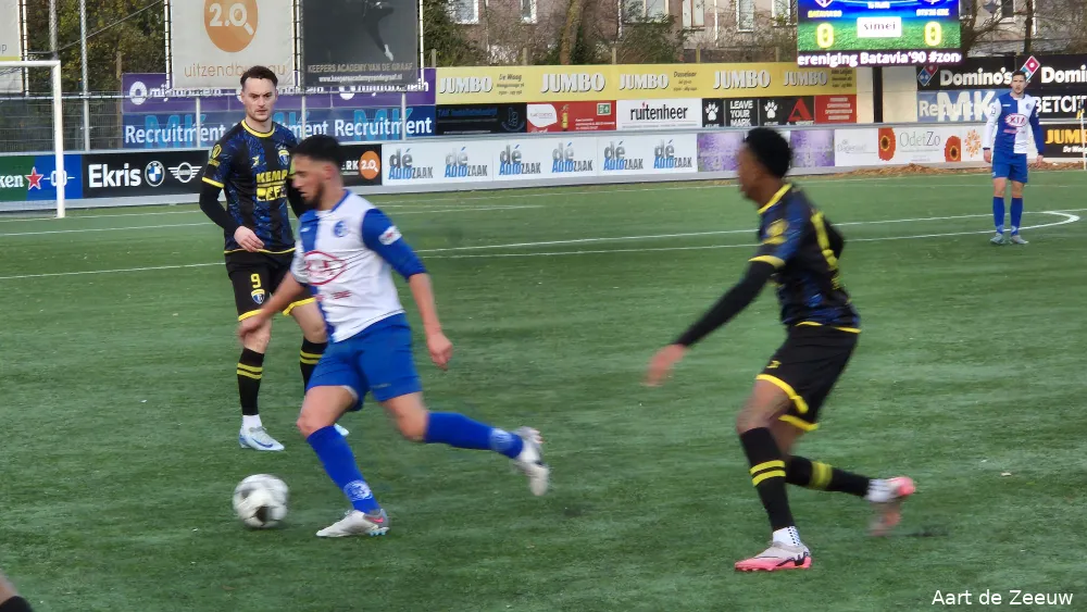 De tweede helft is amper begonnen als de ingevallen Arthur Gatsjatrian van dichtbij binnen kan schieten, maar de Batavia goalie weet met een duik een treffer te voorkomen. Het wachten is op een Edese treffer. In de 53e minuut heeft DTS Ede dan geen geluk als een goed genomen vrije trap, rand zestien van Bilal Tmim, tegen de onderkant lat wordt gekopt door Chiel Willems. En dan gebeurt wat we wel vaker op de voetbalvelden zien. De thuisploeg, die amper aanvallend voor gevaar had kunnen zorgen, weet met een vliegensvlugge counter toe te slaan. De vandaag bij tijd en wijlen ongrijpbare Samir Merraki weet Donovan Roudier te lanceren vanaf eigen helft, die vervolgens met een beauty van een schot de bal over keeper Robin Franken in de rechterbovenhoek binnen schiet; 1-0. DTS Ede moet zich herpakken, maar heeft hier moeite mee. De thuisploeg weet de snelheid goed uit het spel te halen en onderschept te vaak in de Edese opbouw. Met wat wissels probeert Coach Brehler het tij te doen keren. En daar slaagt hij uiteindelijk in. Het is Frank Boers, die in de 91e minuut, na een hakje vanaf de achterlijn van Chiel Willems, van dichtbij de bal snoeihard in de kruising binnenjaagt; 1-1. Er volgen nog wat extra minuten, maar ondanks grote Edese druk wordt er niet meer gescoord.